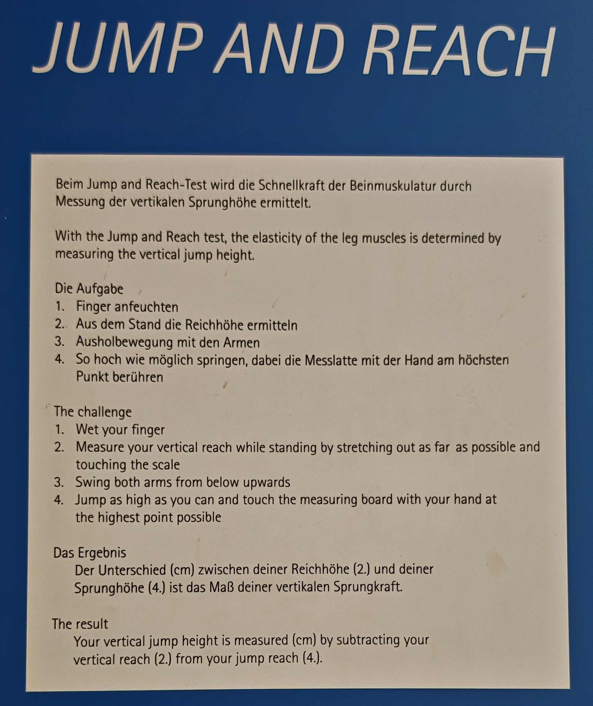 Die einfachste Methode ist dabei wohl der „Jump and Reach Test“, bei dem die Ermittlung der Sprunghöhe über die Messung der Differenz von im Stand ausgestrecktem Arm zur erreichten Höhe bei im Sprung gestrecktem Arm geschieht. Diese Vorgehensweise erfordert nur ein Mindestmaß an Equipment und wird seit Jahrzehnten eingesetzt. So finden sich beispielsweise im Deutschen Sportmuseum folgende Tafeln, die den Besucher zur Aktion animieren: